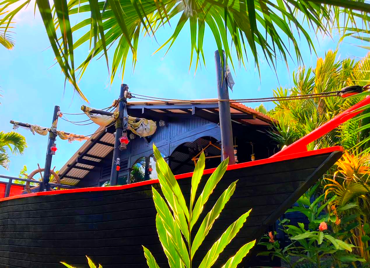 La cabane du pirate et son jacuzzi privatif dans un bateau vous transporteront dans un autre monde ! Dans un esprit typiquement créole, la cabane est entièrement construite en bois de Guyane.